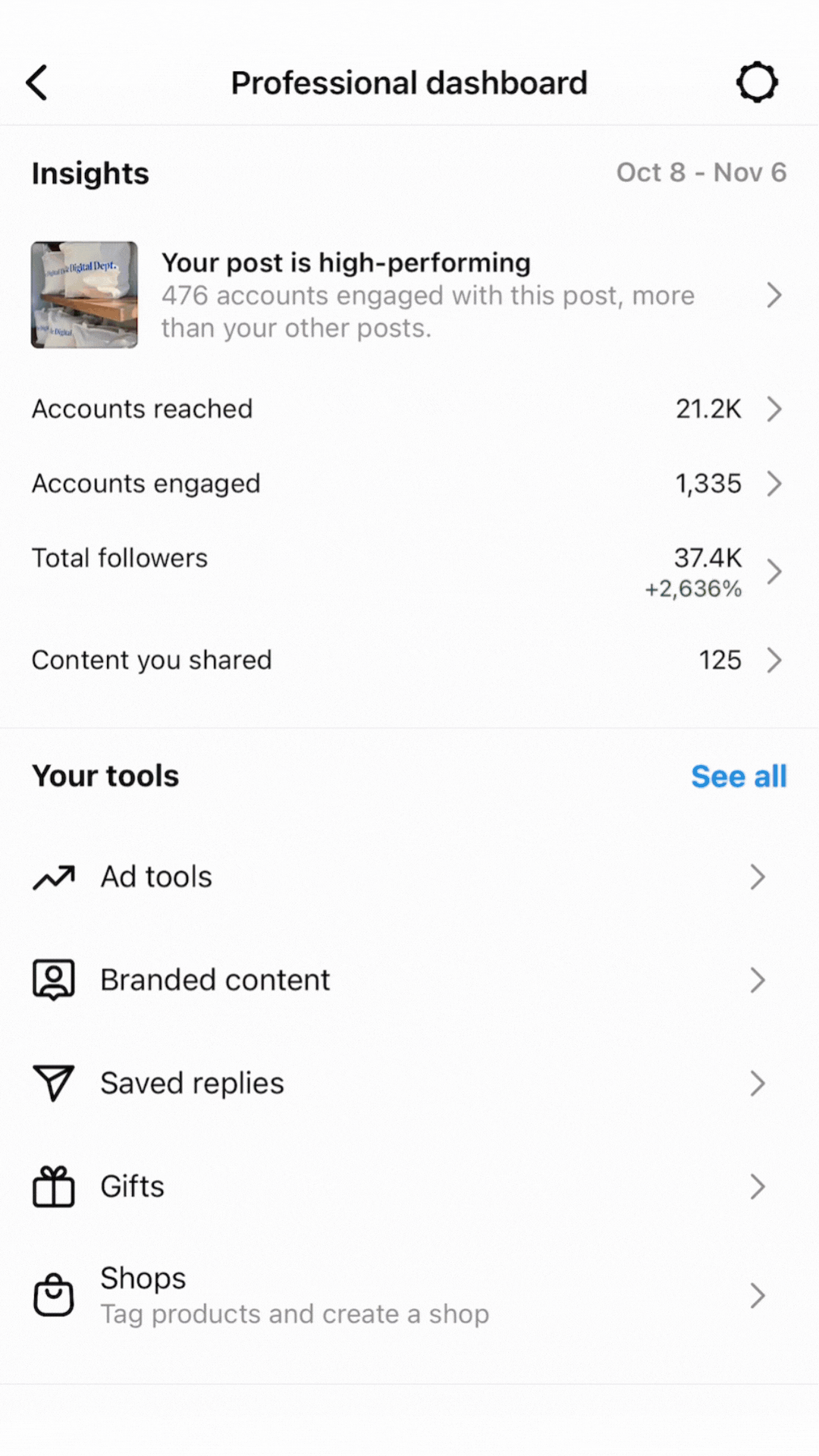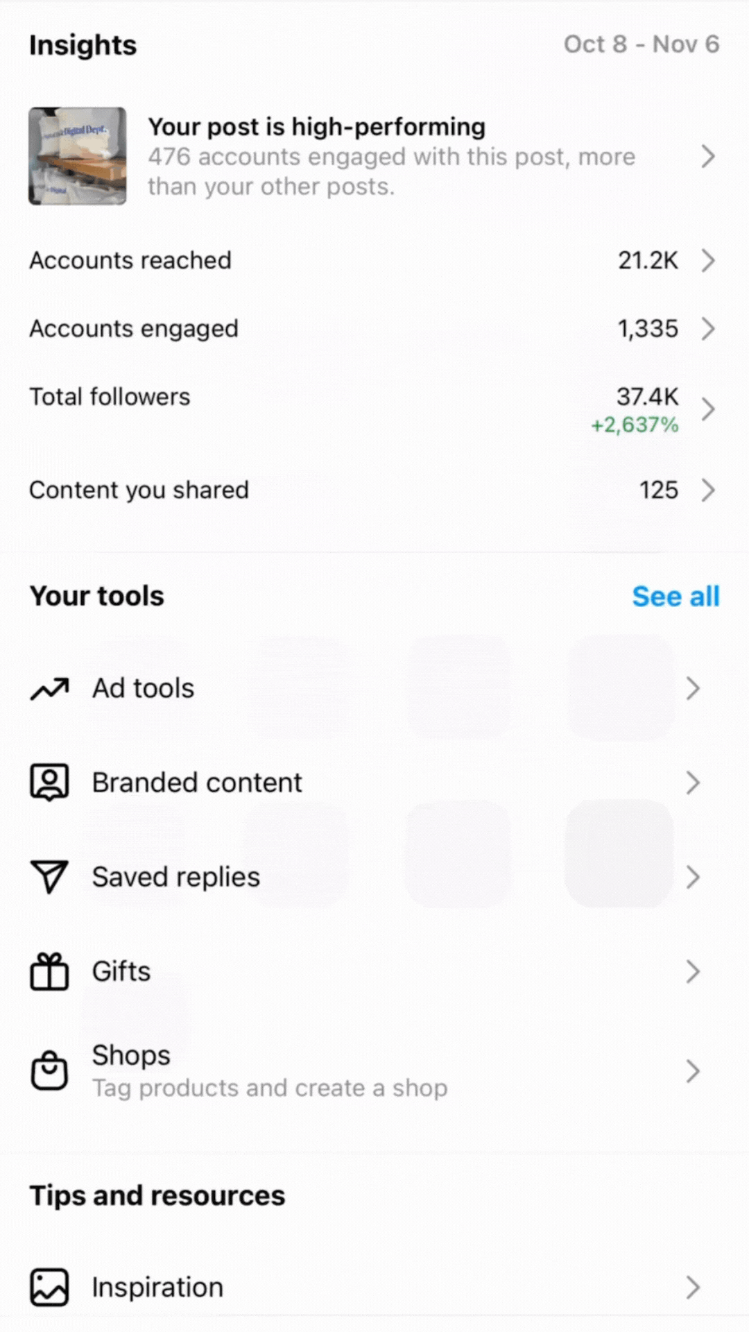 This will bring you to a page that shares an overview of your analytics, high performing content, as well as creator and business tools. But we want to delve deeper into your insights.