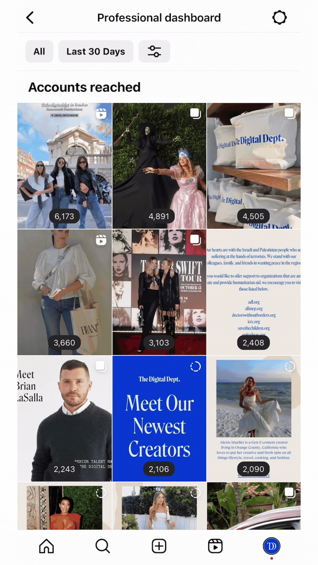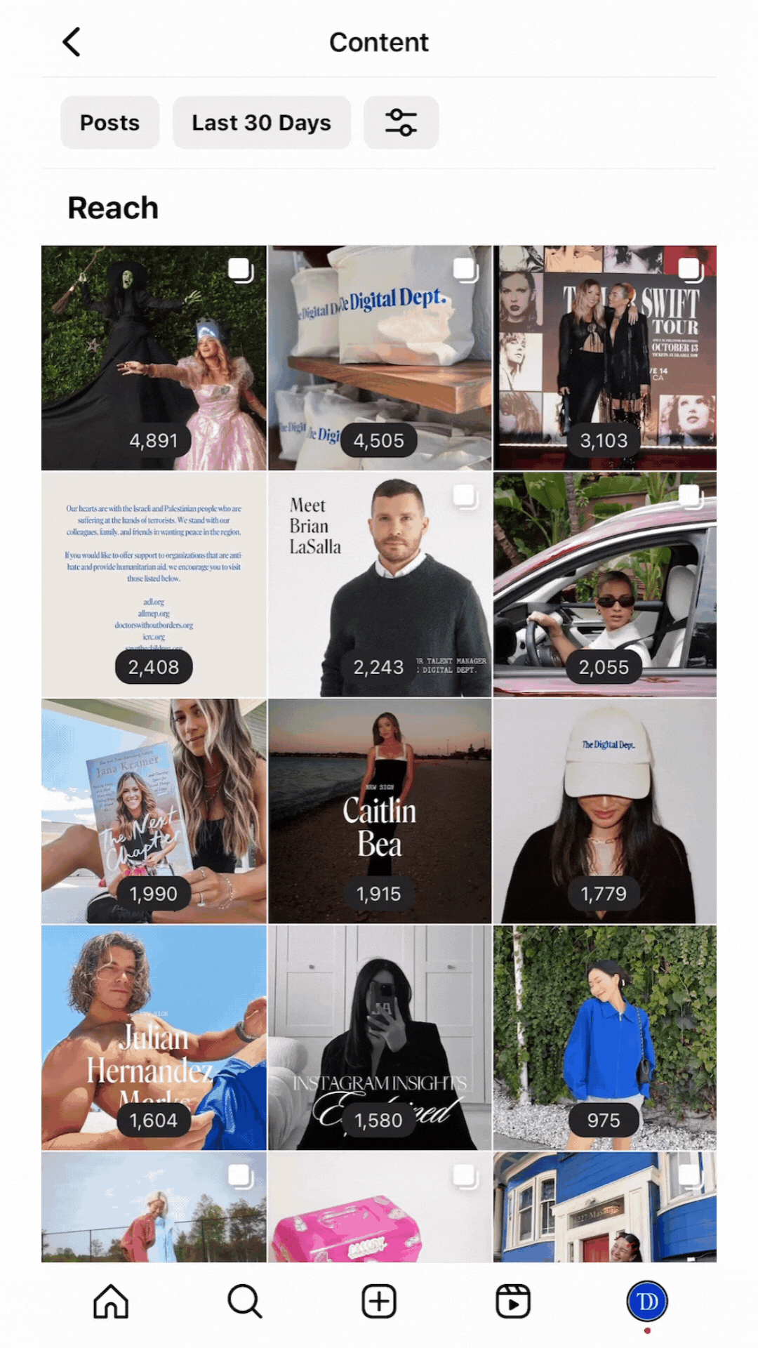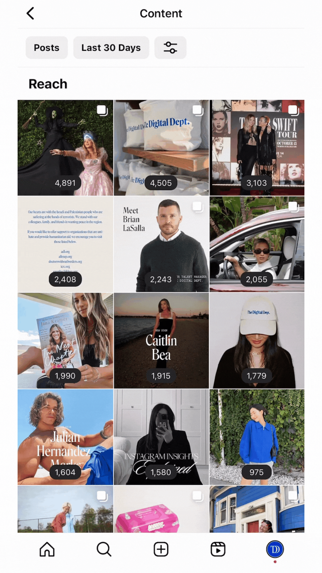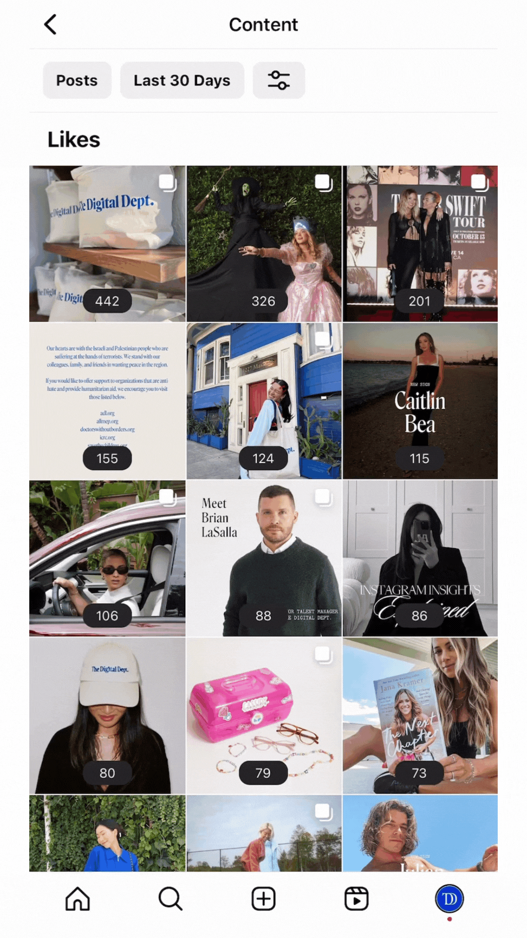 You can toggle to different post types, including Posts, Reels, Stories, Videos, and Live Videos.